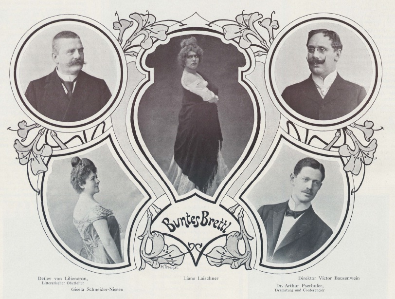 Bilder: E. Höffert: Das Ensemble des Bunten Brettls („Überbrettls“); aus der Zeitschrift Berliner Leben (Heft 10, 1901); Wikimedia commons; abgebildete Personen links: Detlev von Liliencron („Literarischer Oberleiter“), Gisela Schneider-Nissen; Mitte: Liane Laischner (Leischner); rechts: Victor Bausenwein (Direktor), Arthur Pserhofer (Dramaturg und Conférencier);Willy Oertel: unter dem Pseudonym „Serapion Grab“ herausgebrachtes Werbeplakat für die Elf Scharfrichter, 1901 (Wikimedia commons); Georg Bartels: Foto des Bunten Brettls (Überbrettls), 1901 (Wikimedia commons); E. Bieber: Ernst von Wolzogen, 1899 (Wikimedia commons)