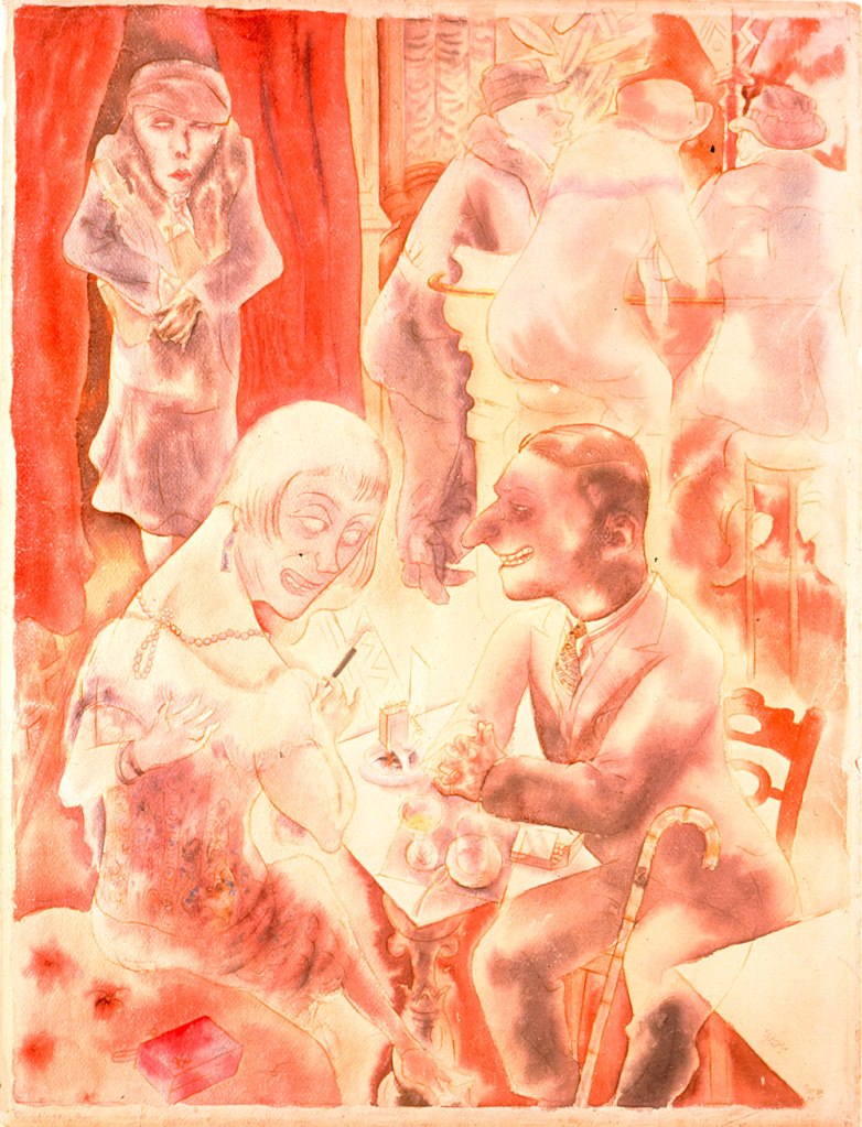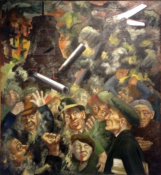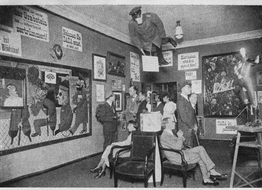 Bilder: Feierliche Eröffnung der ersten Dada-Ausstellung in Berlin am 5. Juni 1920; von links nach rechts: Raoul Hausmann, Hannah Höch (sitzend), Otto Burchard, Johannes Baader, Wieland Herzfelde, Margarete Herzfelde, Dr. Oz (Otto Schmalhausen), George Grosz und John Heartfield; an der Decke eine Plastik eines deutschen Offiziers mit einem Schweinekopf (aus: Richard Huelsenbeck: Dada-Almanach, S. 128. Berlin 1920: Reiss).; Peter Ludwigs (1888 – 1943): Der Krieg (1937); Museum Kunstpalast Düsseldorf (Wikimedia commons); Richard Huelsenbeck (links) und Raoul Hausmann während ihrer Dada-Tournee Anfang 1920 in Prag; Foto aus dem von Huelsenbeck im selben Jahr herausgegebenen Dada-Almanach (Wikimedia commons); George Grosz (1893 – 1959): Plauderei (1925); Botero Museum, Bogotá/Kolumbien (Wikimedia commons)