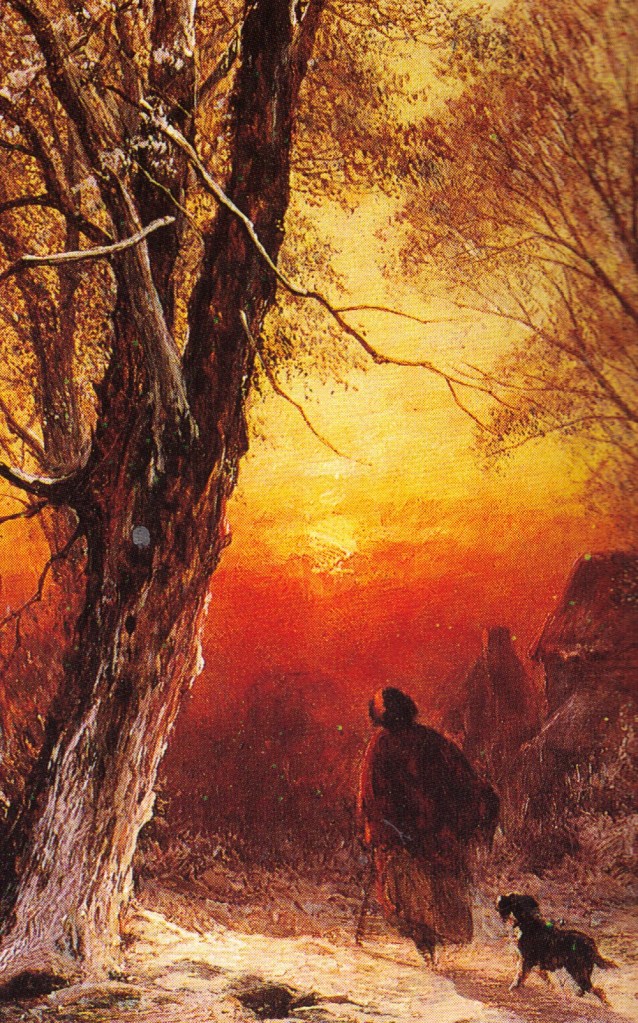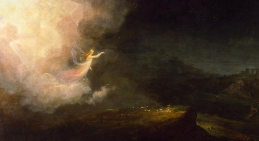 Bilder: Thomas Cole (1801 – 1848): Der Engel erscheint den Hirten (1833/34); Chrysler Museum of Art, Norfolk/Virginia ( Detail); Caroline F. Williams (1836 – 1921): Winterabend (Ausschnitt)
