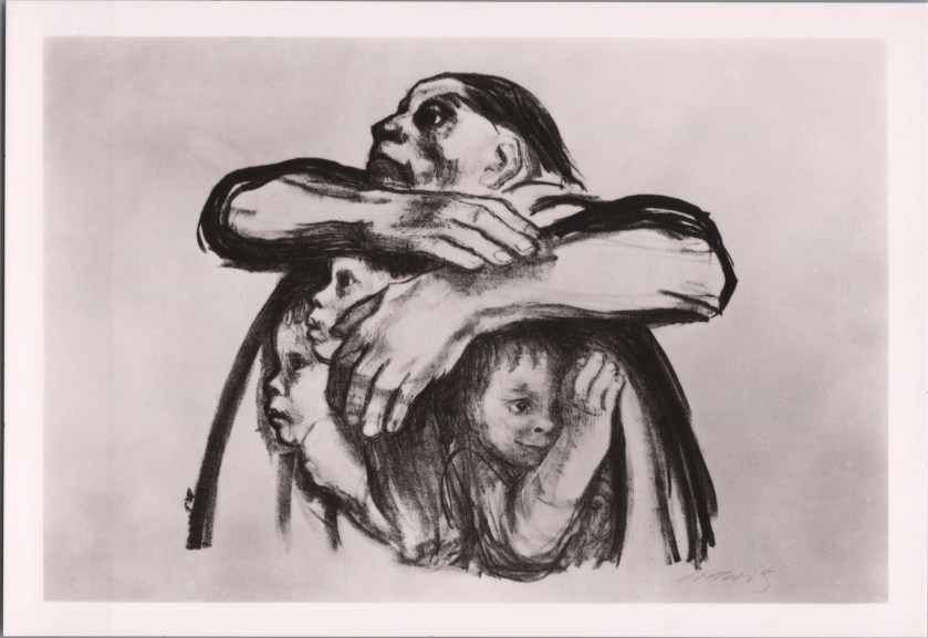 Bild: Käthe Kollwitz (1867 – 1945): „Saatfrüchte sollen nicht  vermahlen werden“ (1941; Kreidelithographie mit Kollwitz-typischer Schutzmantelmadonna, im Original schwarz-weiß; Titel entlehnt aus Goethes Wilhelm Meister; vgl. Käthe Kollwitz Museum Köln); Kunstpostkarte von Brück & Sohn (Wikimedia commons)