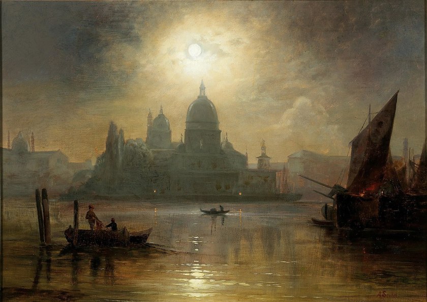 Bild: August Seidel (1820 – 1904): Mondschein über der Kirche Santa Maria della Salute in Venedig (Wikimedia commons)